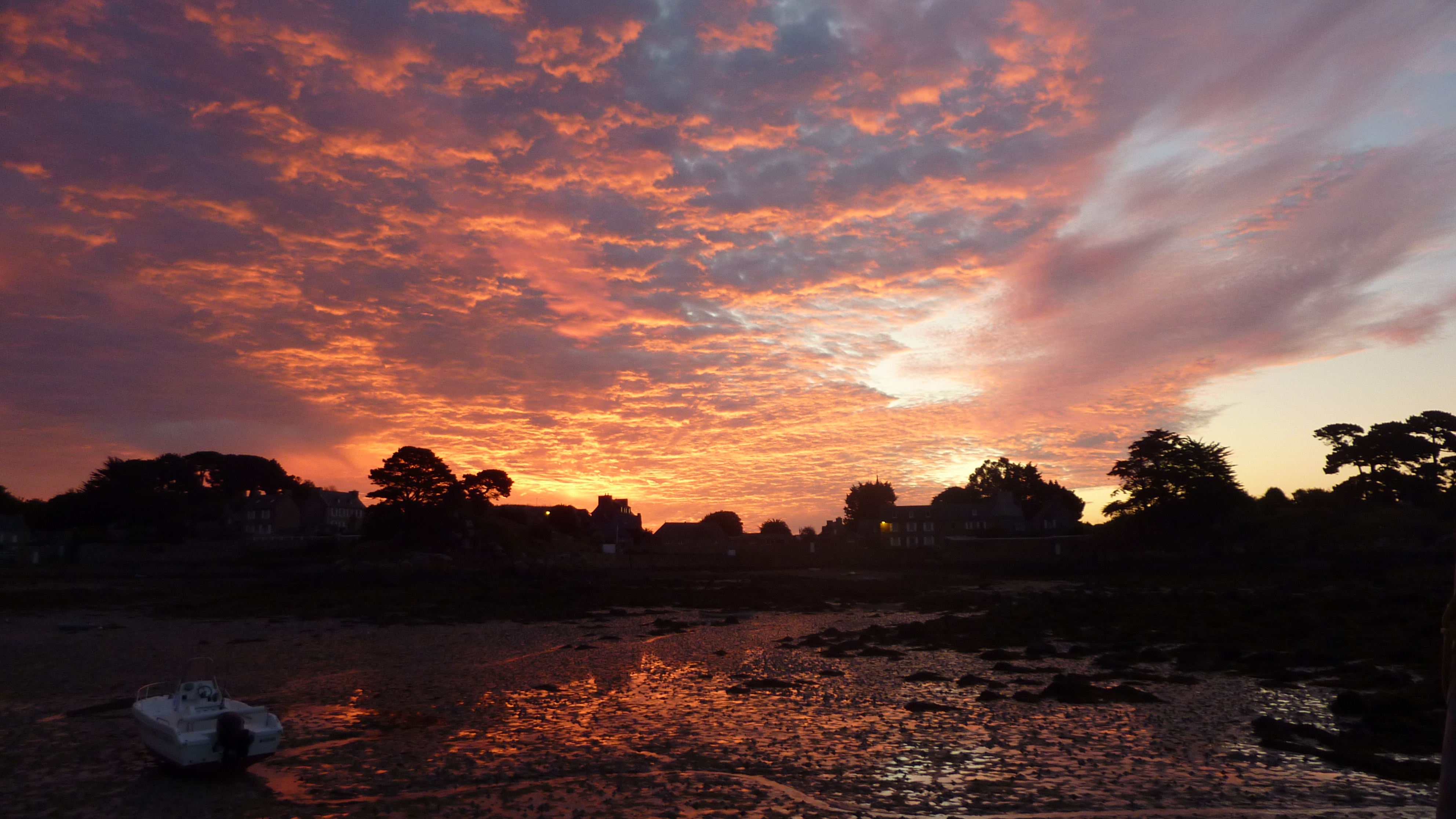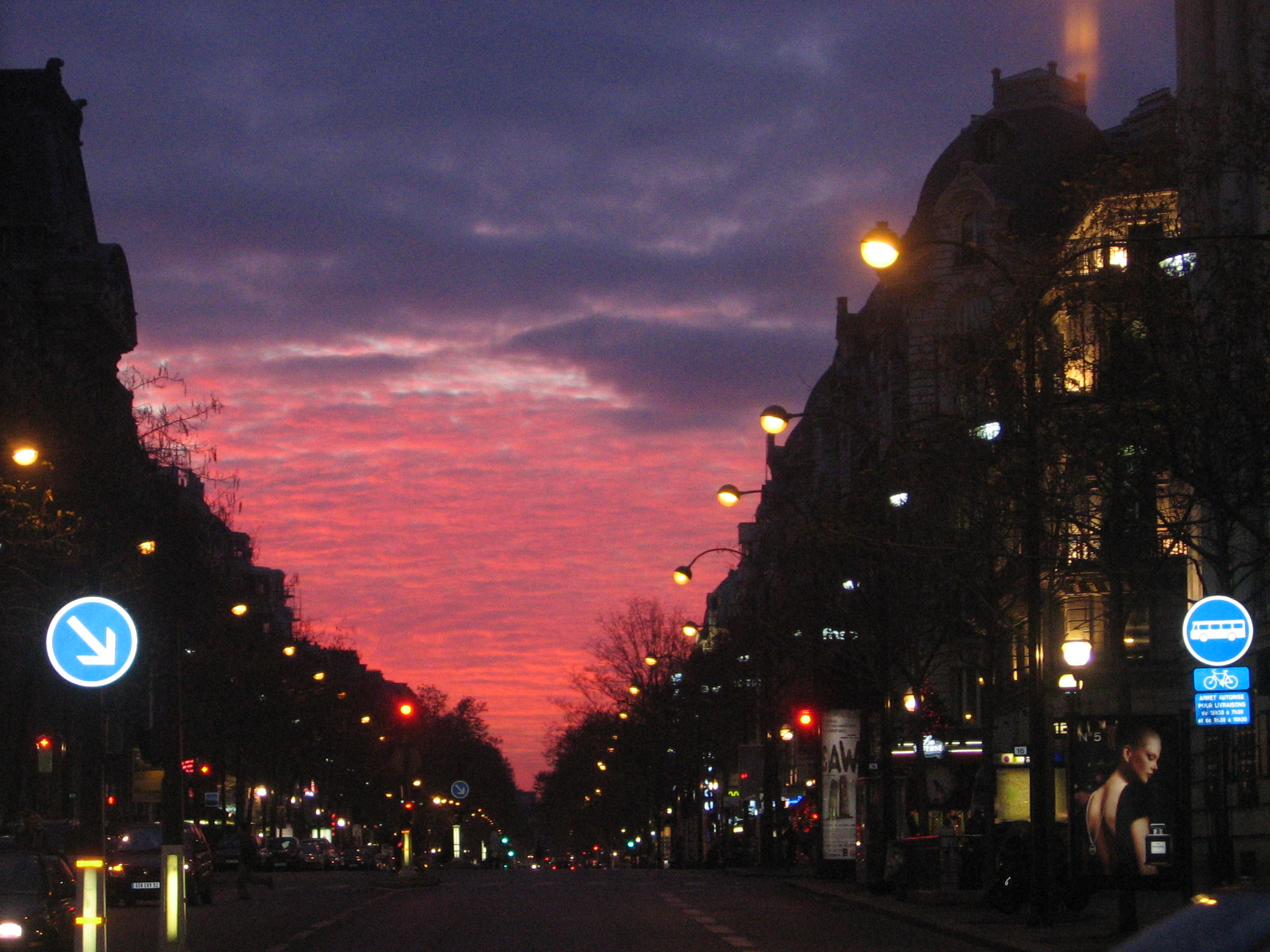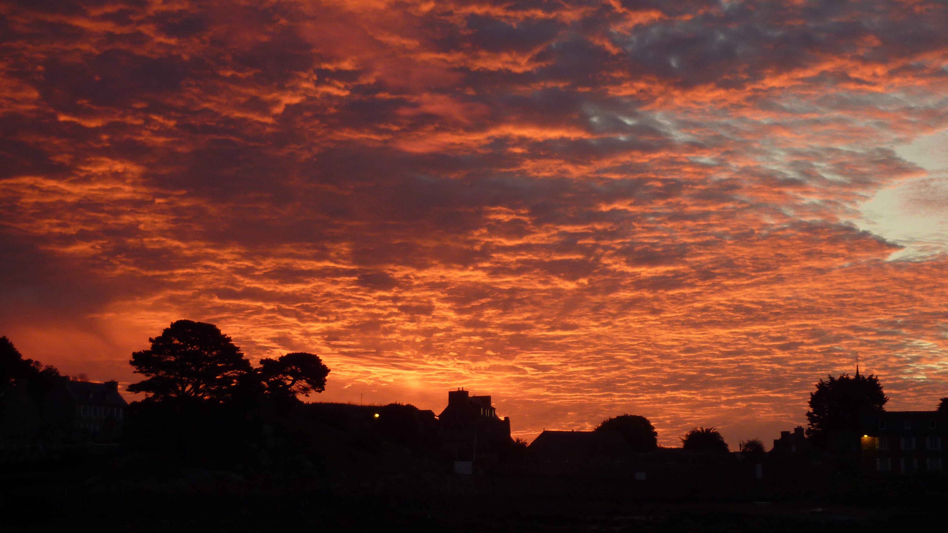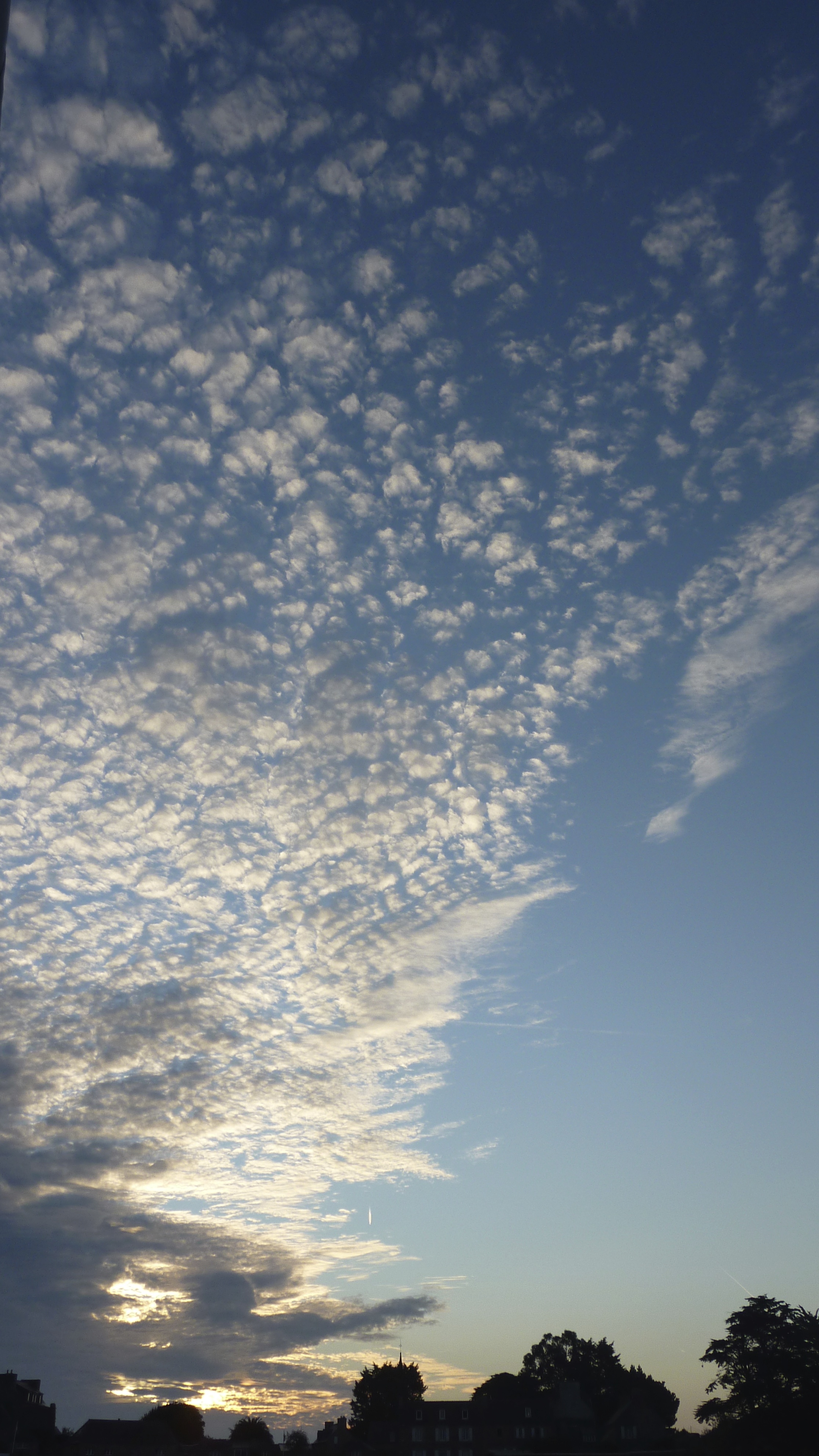 Levée tôt pour voir mieux le jour venir au monde, je contemple le ciel devenu bleu et rose. De très petits nuages, par le dessous s’empourprent, et comme intimidés peu à peu s’évaporent.